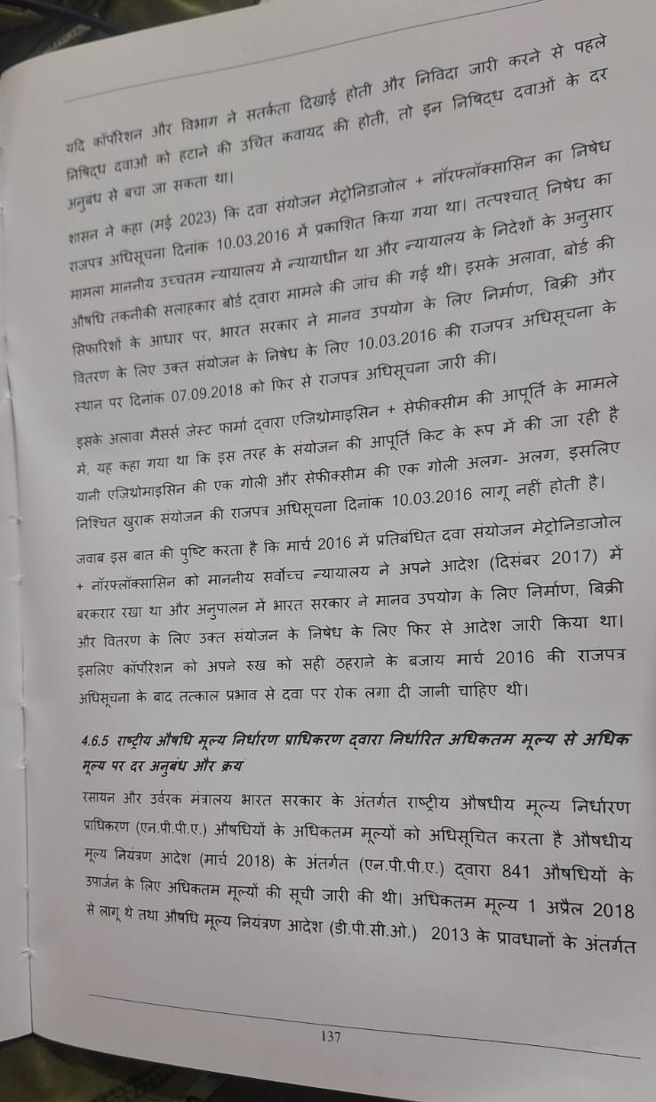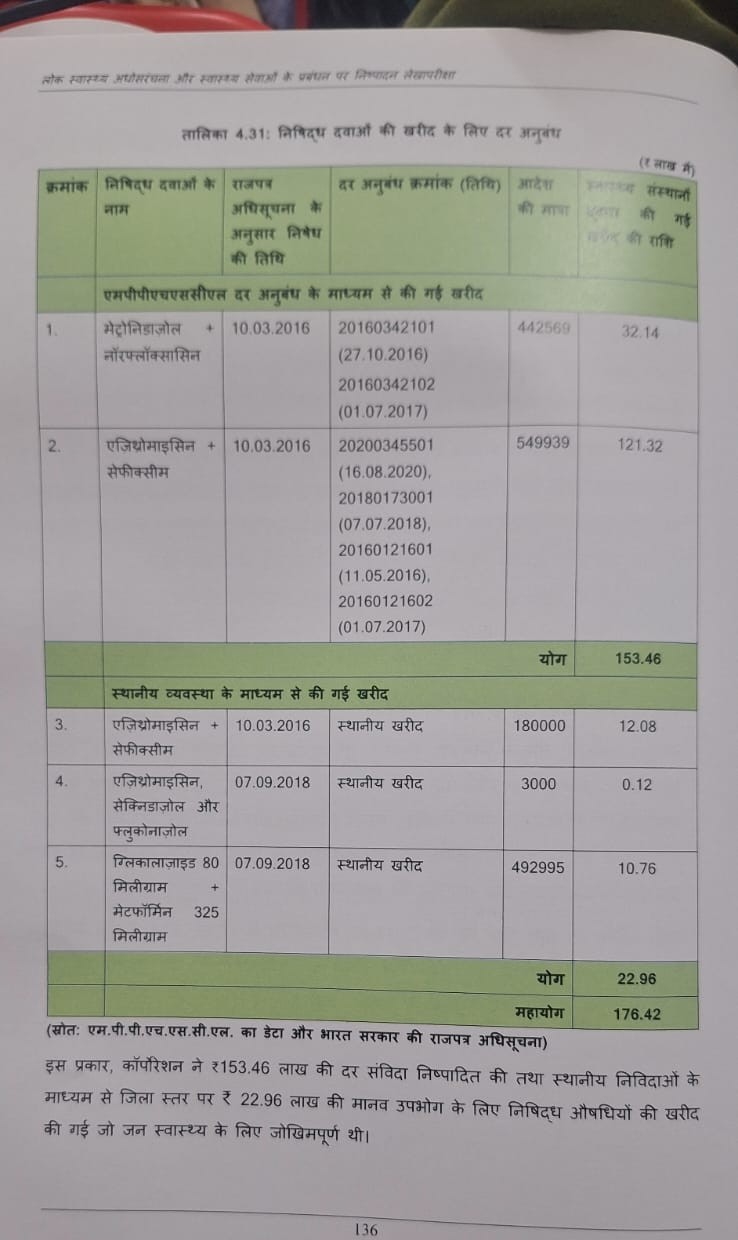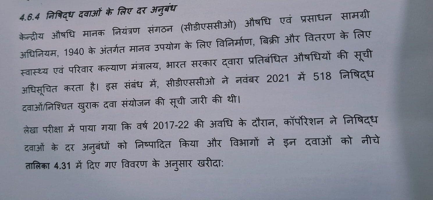 कैग की 2024-2025 की रिपोर्ट में ये बताया गया है कि "जिन 518 दवाओं को भारत सरकार के स्वास्थ्य एवं परिवार कल्याण मंत्रालय ने बैन कर दिया था. कैग कि रिपोर्ट ये बताती है कि 2017 से 2022 के बीच में निगम ने इन्ही प्रतबंधित दवाओं के लिए इन दवा कंपनियों से 153.46 लाख का अनुबंध तय किया और जिला स्तर पर लोकल टेंडर के जरिए 22.96 लाख रुपए की दवाओं की खरीद भी कर डाली. उन दवाओं की खरीद जो कि मानव उपभोग के लिए पूरी तरह से प्रतिबंधित थी.