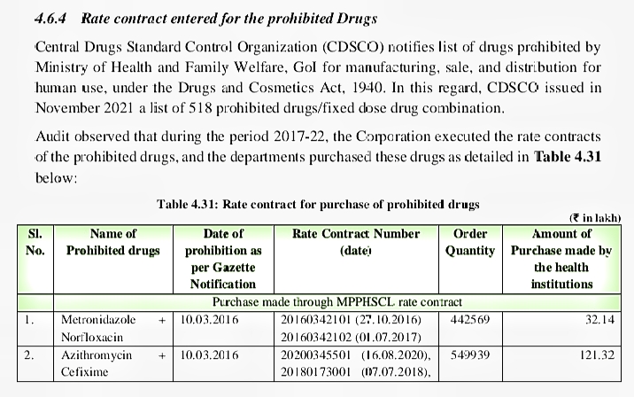 कैग रिपोर्ट बताती है कि सेंट्रल ड्रग्स स्टैंडर्ड कंट्रोल ऑर्गनाइजेशन ने ड्रग्स एंड कॉस्मेटिक्स एक्ट, 1940 के तहत नवंबर 2021 में 518 दवाओं और उनके संयोजनों की सूची जारी की थी, जिनका निर्माण, बिक्री और वितरण देशभर में प्रतिबंधित था. इसके बावजूद मध्यप्रदेश की इस सरकारी एजेंसी ने न केवल इन्हीं दवाओं के लिए टेंडर जारी किए बल्कि अस्पतालों को उनकी सप्लाई भी कर दी.