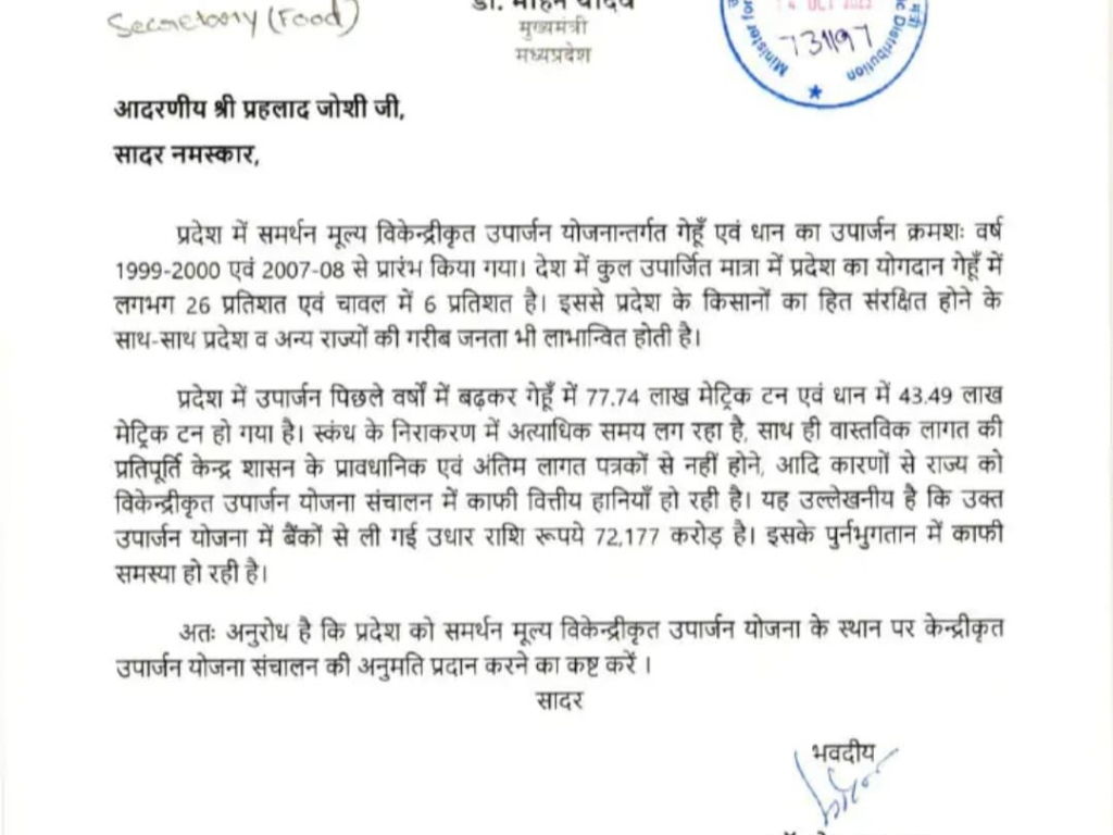 इस संबंध में मुख्यमंत्री मोहन यादव ने केंद्र सरकार के उपभोक्ता मामले, खाद्य एवं सार्वजनिक वितरण मंत्रालय को पत्र लिखा है।