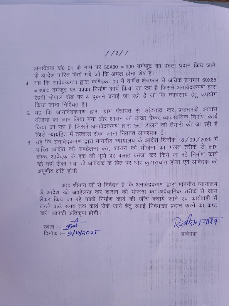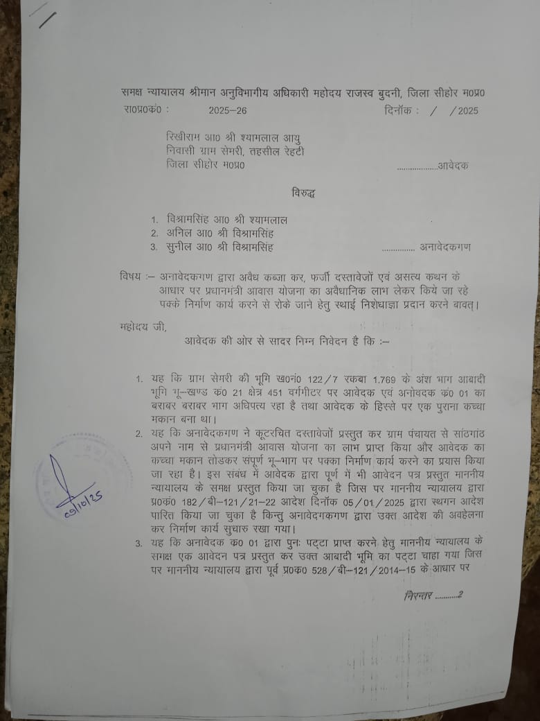 दरअसल मध्यप्रदेश के सीहोर के रेहटी के ग्राम सेमरी में प्रधानमंत्री आवास योजना के तहत निर्माण कार्य को लेकर आवेदक रिखीराम आ० शयामलाल ने अपने भाई विश्रामसिंह और उसके बेटों अनिल व सुनील पर अवैध कब्जा करने, फर्जी दस्तावेज़ों से सरकारी योजना का लाभ लेने और पक्के व्यावसायिक निर्माण का आरोप लगाया है।
