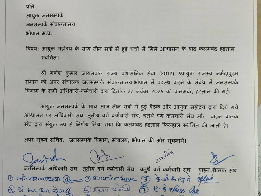 मध्यप्रदेश जनसंपर्क अधिकारी संघ द्वारा जारी पत्र के अनुसार जनसंपर्क आयुक्त से आश्वासन मिलने के बाद हड़ताल को स्थगित कर दिया गया।